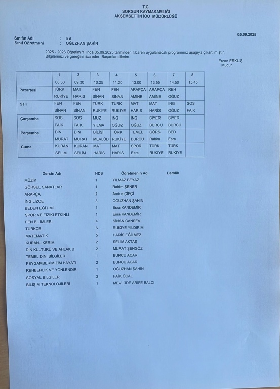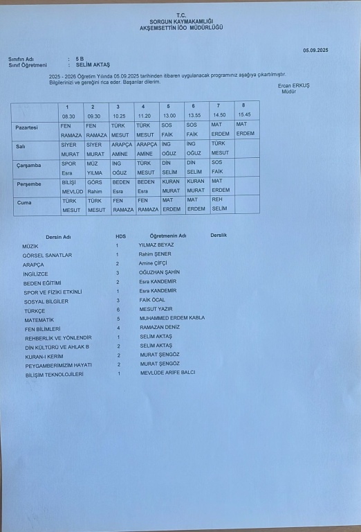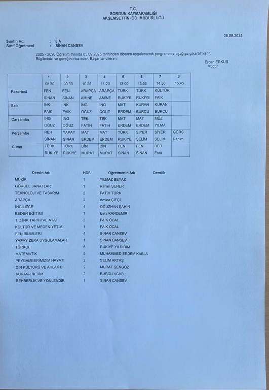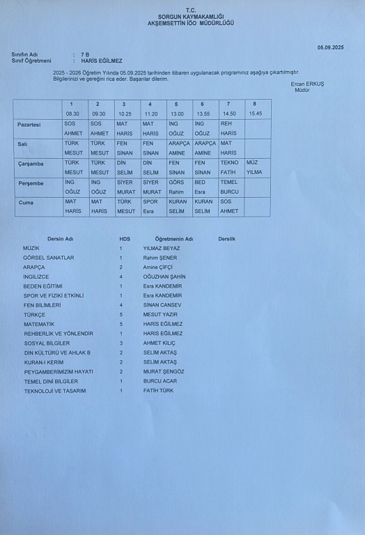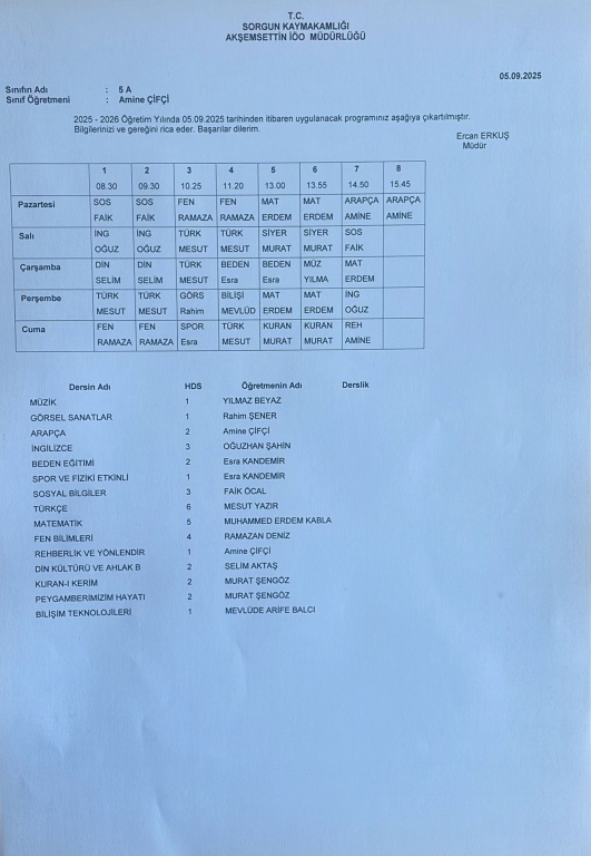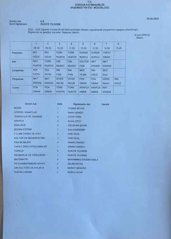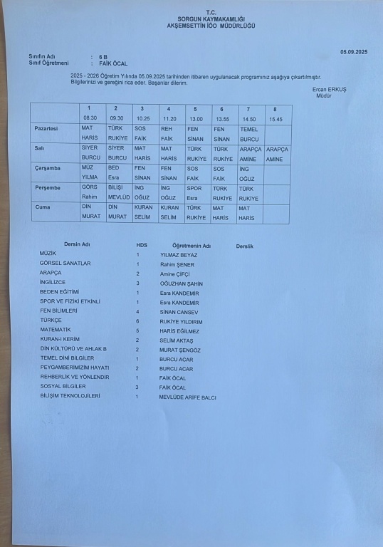 Sayın Velimiz Değerli Öğrencilerimiz:08.09.2025 tarihi pazartesi gününden itibaren uygulayacağımız vakit çizelgesi,ders proğramı ve öğretmen bilgilerimiz aşağıda sunulmuştur.